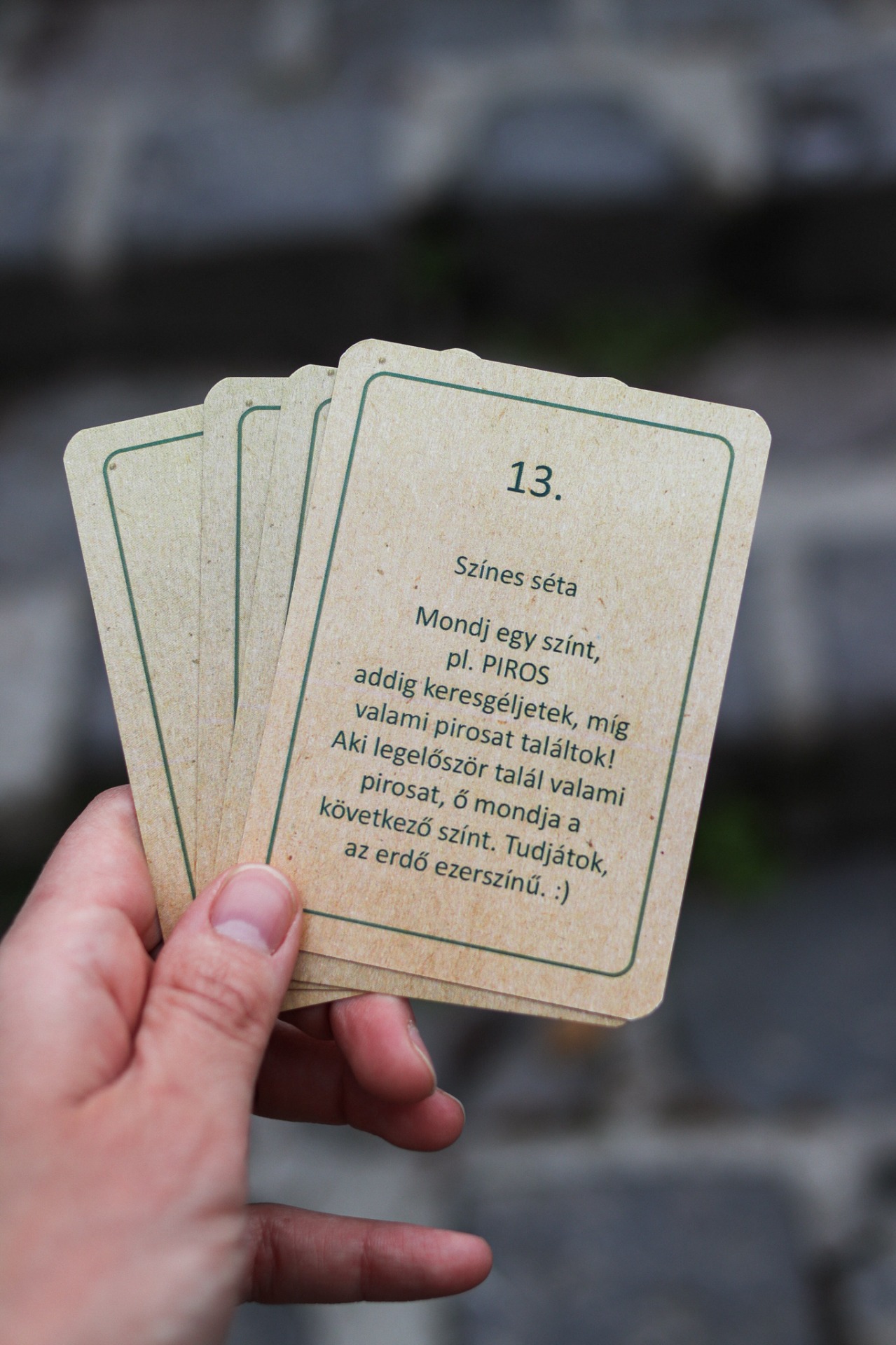 A játékok között mozgásos, képzeletfejlesztő, alkotó és ismeretterjesztő feladatok vannak melyeket erdőkben, parkokban is lehet játszani.
